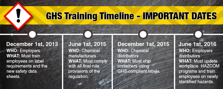 When is the deadline for providing training?You must start your training right away. OSHA has mandated that employees must be trained by December 1st, 2013. See the timeline below. What do I need to do now?STEP 1. Train your employees in the new GHS label elements. STEP 2.Train your employees in the new safety data sheet (SDS) format. |